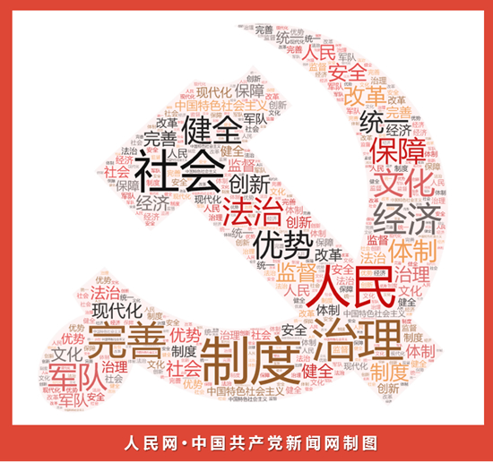 5000余字的全会公报中,“制度”一词出现的频率最高,达到了77次。此外,“人民”52次,“治理”41次,“完善”41次,“中国特色社会主义”24次,“经济”19次,“健全”18次,“优势”17次,“文化”16次,“法治”16次,“军队”16次,“保障”13次,“体制”13次,“统一”13次,“现代化”11次,“改革”11次,“监督”8次,“创新”7次,“安全”7次 …… 这些高频词以点带面,勾勒出一张坚持和完善中国特色社会主义制度、推进国家治理体系和治理能力现代化的发展蓝图。