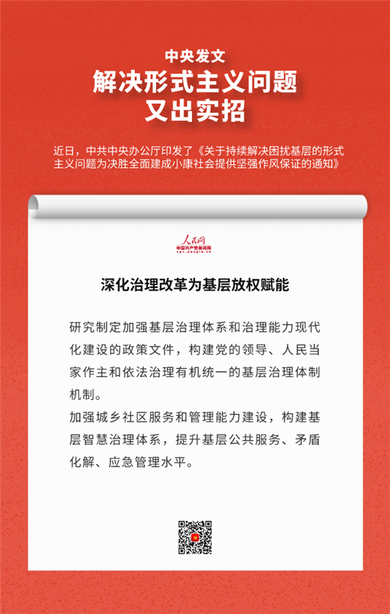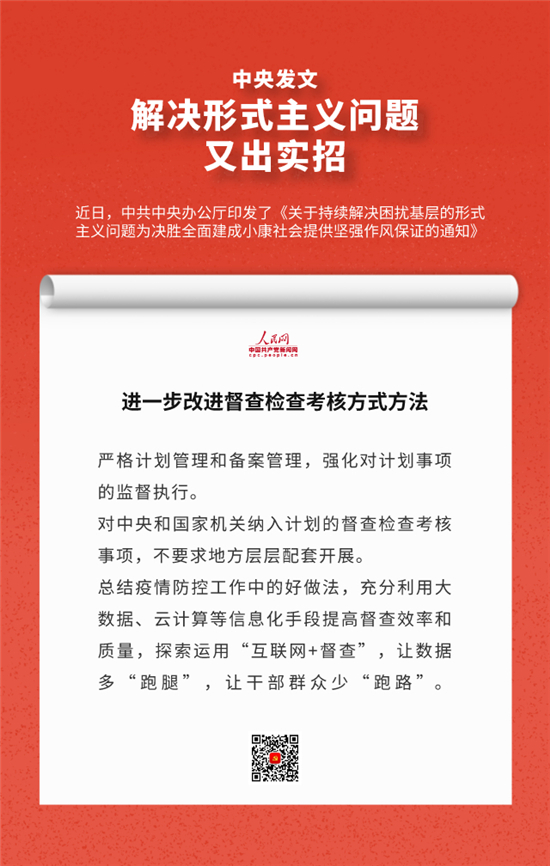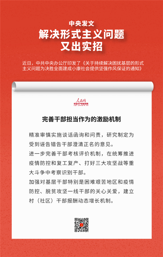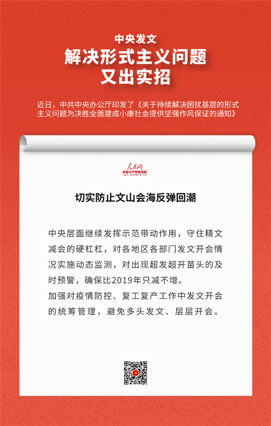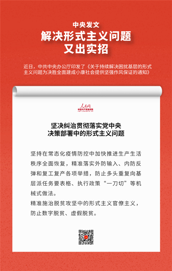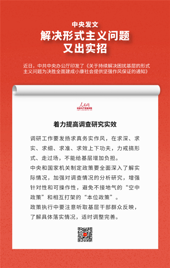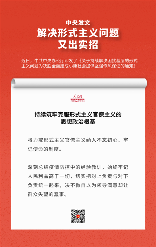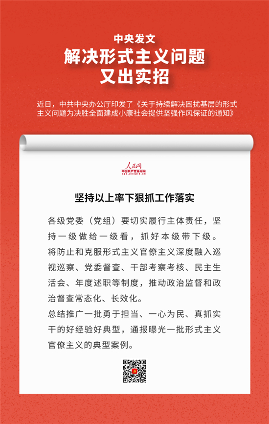 编者按:近日,中办印发《关于持续解决困扰基层的形式主义问题为决胜全面建成小康社会提供坚强作风保证的通知》,通知要求牢固树立正确政绩观,始终牢记人民利益高于一切,切实把对上负责与对下负责统一起来,决不做自以为领导满意却让群众失望的蠢事。通知还有哪些重要内容,人民网·中国共产党新闻网制作推出系列海报带您速览。